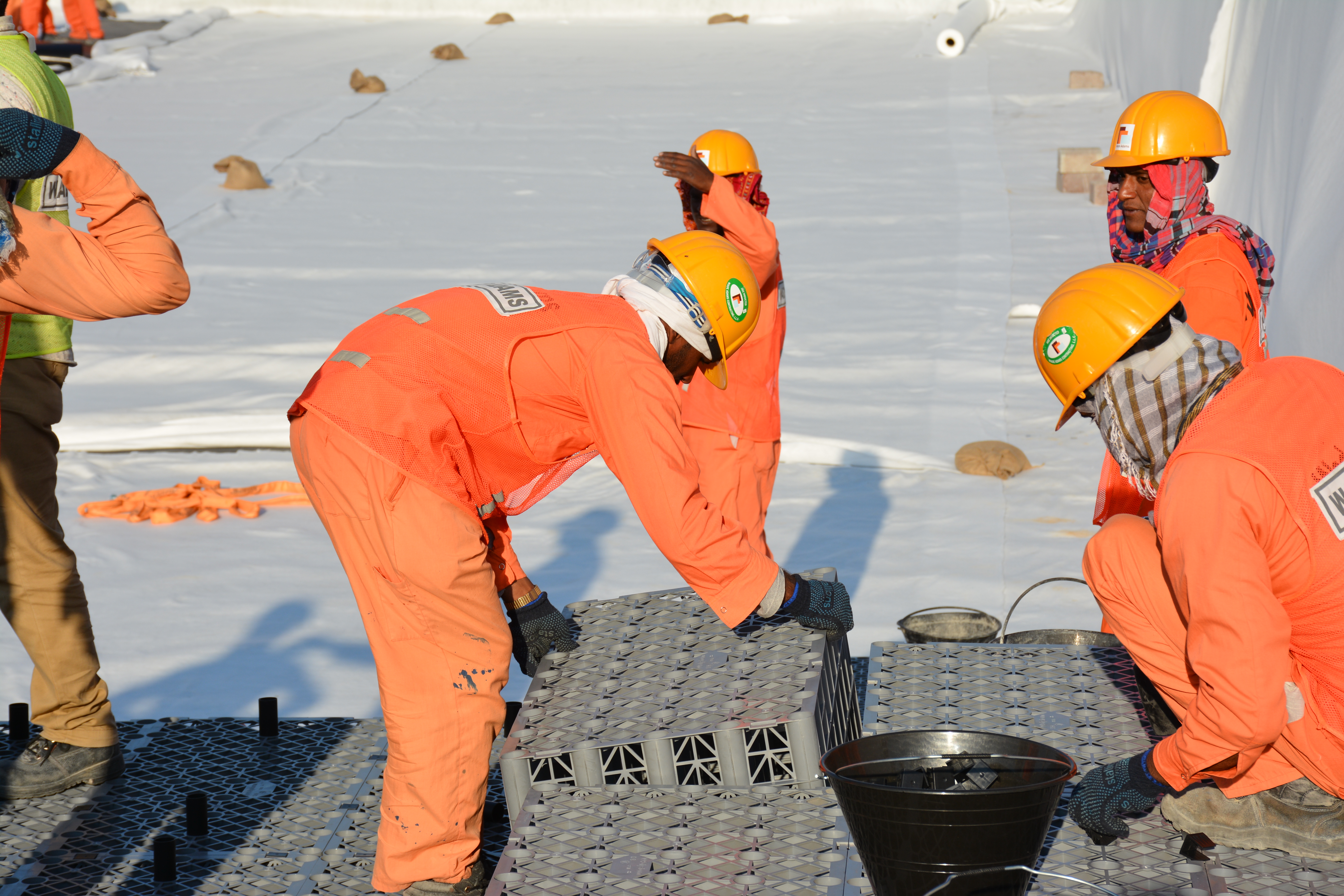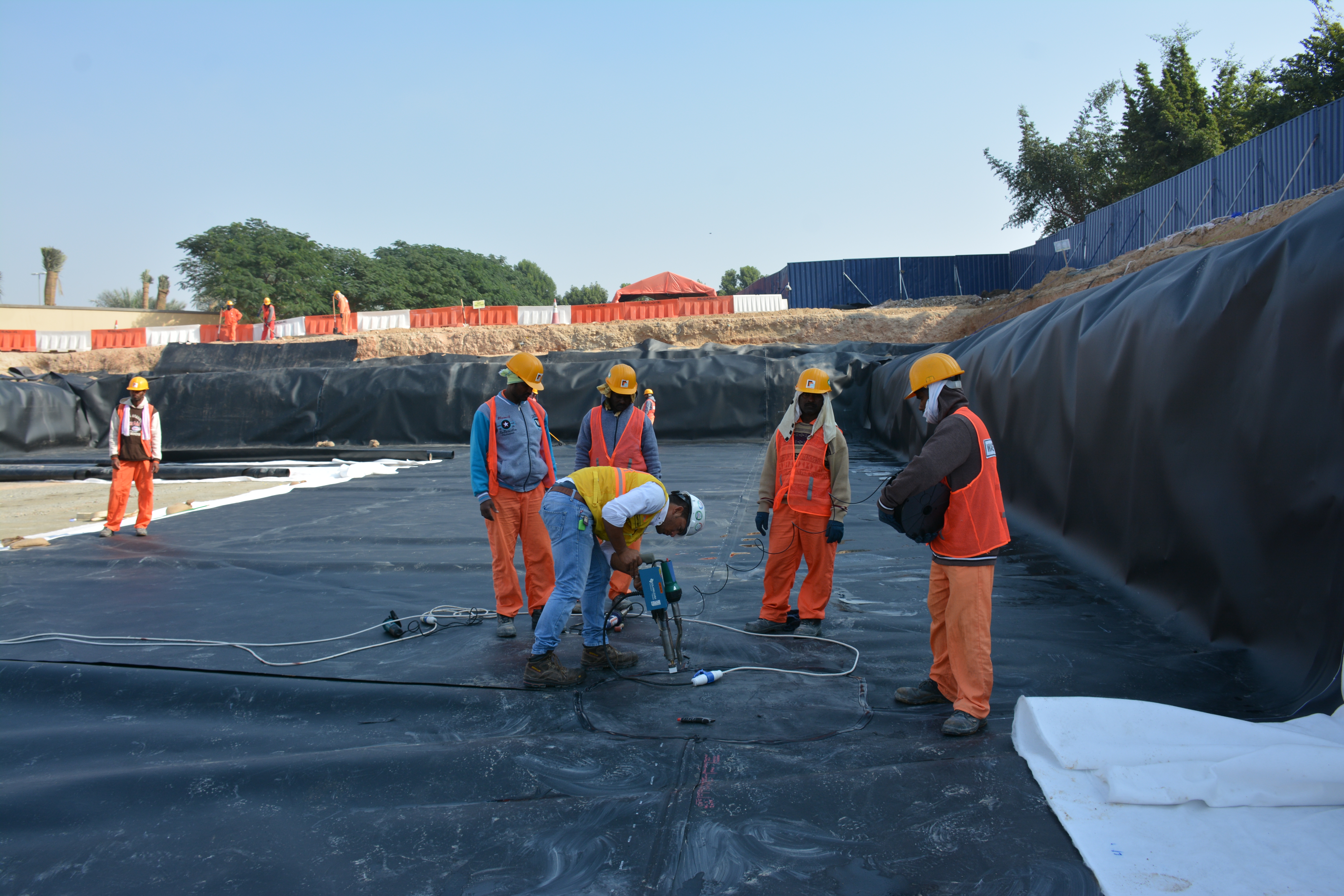 Workers line the space with the geomembrane before installing the Polystorm tank at Remraam in Dubai.