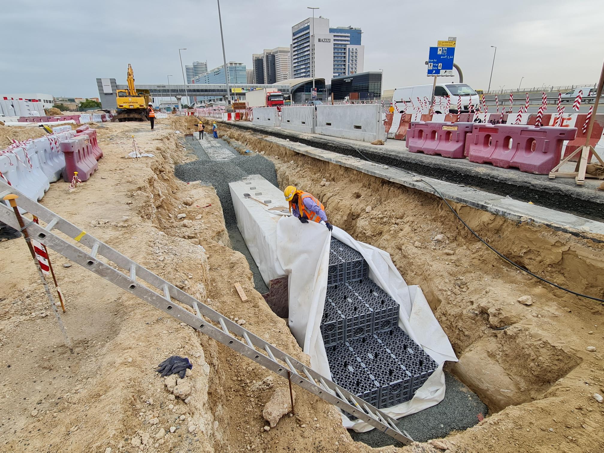 Worker wraps geotextile around Polystorm tank to enable soakaway at the UAE Exchange Metro Station in Dubai.